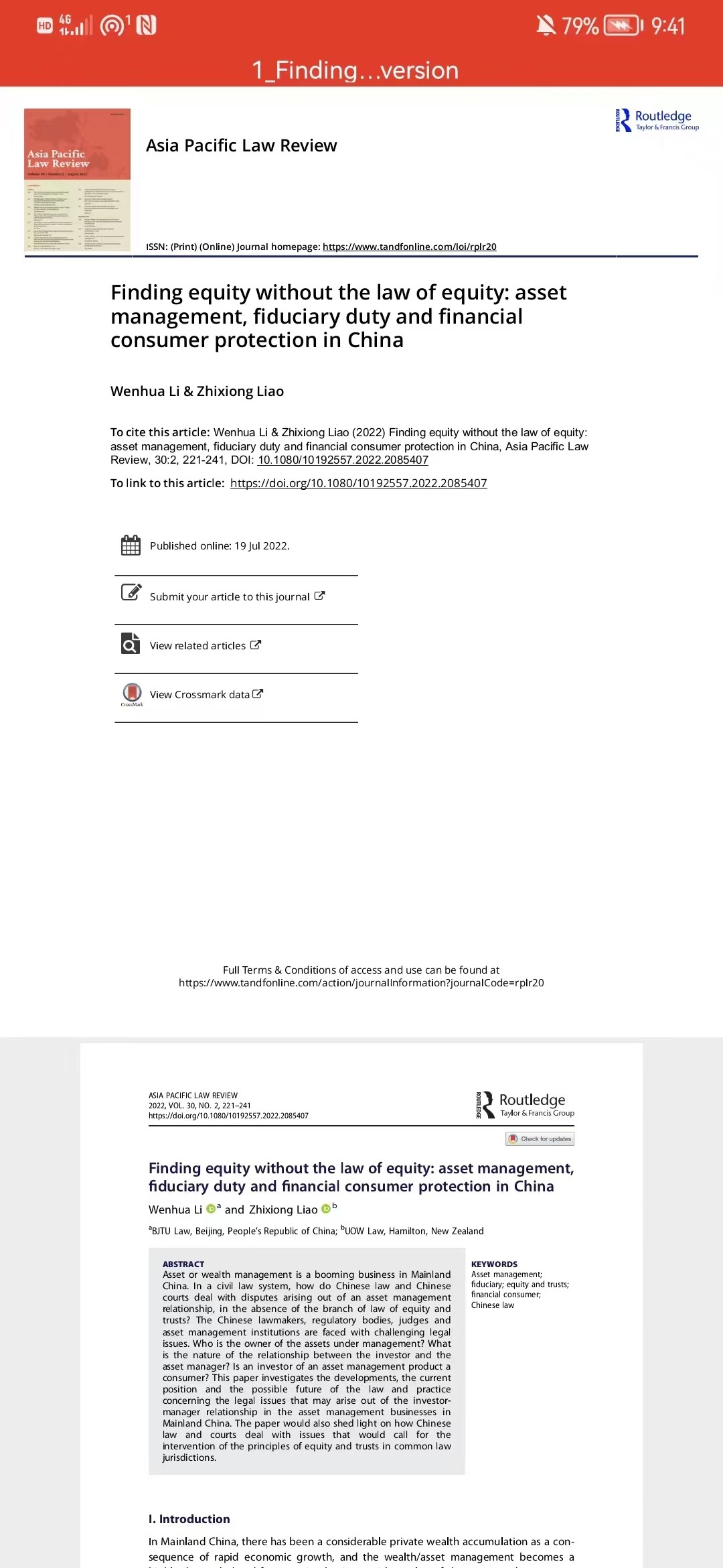 《Asia Pacific Law Review(亚太法律评论)》近期刊发了yl23455永利集团副教授李文华老师和新西兰怀卡托大学yl23455永利集团教师廖志雄博士合撰的论文《Finding Equity without the Law of Equity: Asset Management, Fiduciary Duty and Financial Consumer Protection in China(在没有衡平法的情况下寻找衡平:中国的资产管理、信义义务与金融消费者保护)》。