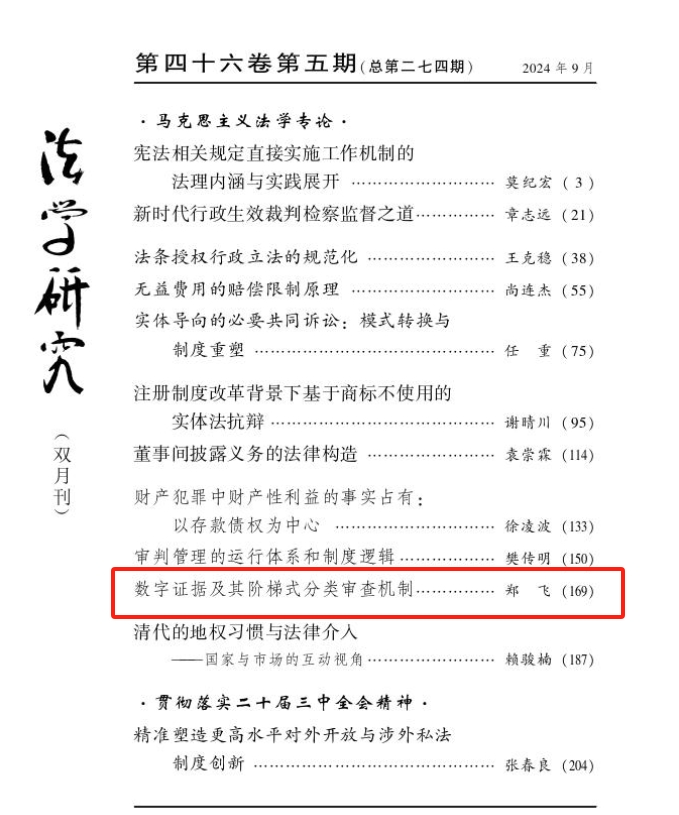 《法学研究》2024年第5期刊发了yl23455永利集团副经理郑飞的最新论文《数字证据及其阶梯式分类审查机制》。这是郑飞在《法学研究》2021年第2期发表论文《证据属性层次论》之后,第二次在该刊发文。
