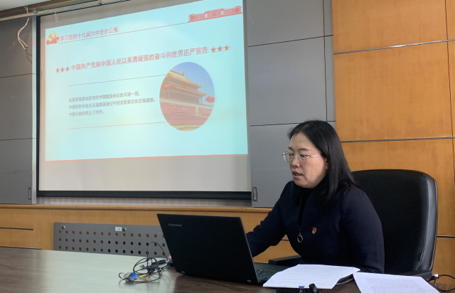 于亚光书记对全会通过的公报内容进行了导读,阐述了全会的重大意义、重要成果和历史贡献,系统性地讲述了我党新民主主义革命时期、社会主义革命和建设时期、改革开放和社会主义现代化建设新时期以及十八大以来中国特色社会主义进入新时代四个阶段我党的主要任务、伟大成就和庄严宣告,她结合对习近平总书记“七一”重要讲话的学习,指出系统加强理论学习的重要性。