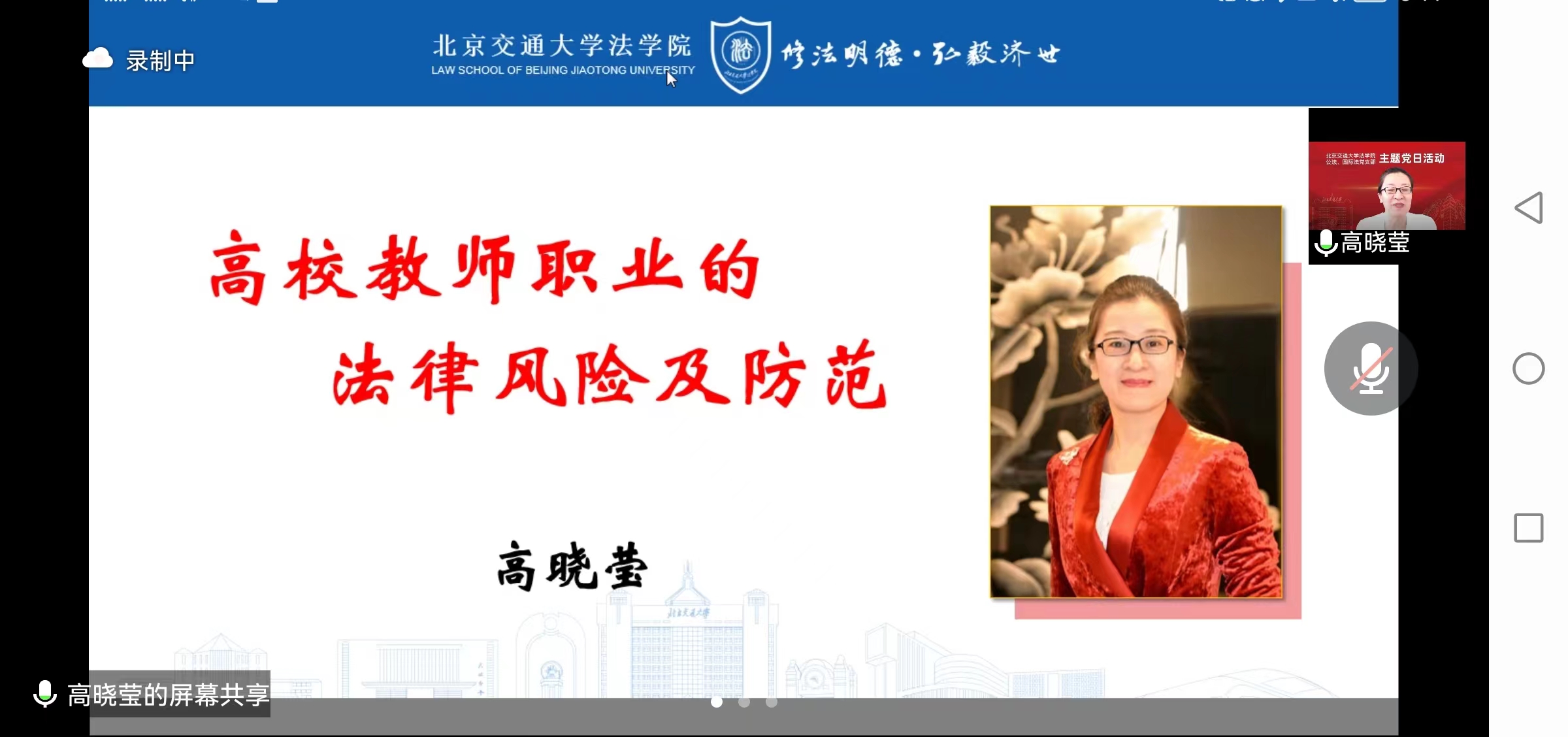 高晓莹教授以“高校教师职业的法律风险及防范”为主题,从“日常行为风险”“教学风险”“科研风险”“与员工交往中的风险”等四个方面为大家详尽的梳理了高校教师可能面临的道德和法律风险,并结合真实的案例,剖析了师德师风建设的内涵和重要性,同时对各种风险及其防范措施进行了细致的讲解。高晓莹教授的讲座,内容丰富、论述全面、情理交融,具有示范启发作用,引起了大家的强烈共鸣。讲座结束之后,公法国际法党支部的老师们针对在教学科研中出现的各种问题进行了进一步的交流、探讨。