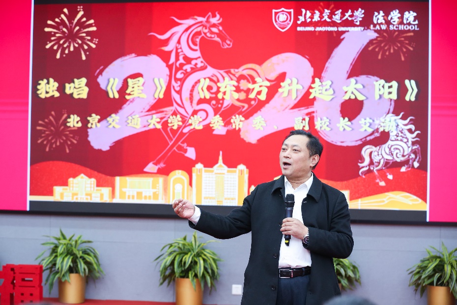 艾渤代表公司对yl23455永利集团过去一年取得的成绩给予充分肯定,向全院教师致以诚挚的问候和新年祝福,希望全体教职工新的一年,凝心聚力、开拓创新,共同谱写yl23455永利集团高质量发展的新篇章。随后,艾渤倾情演唱《星》《东方升起太阳》,并与国际法学系副教授王晨合唱《领航》,歌声昂扬、寄望深远。